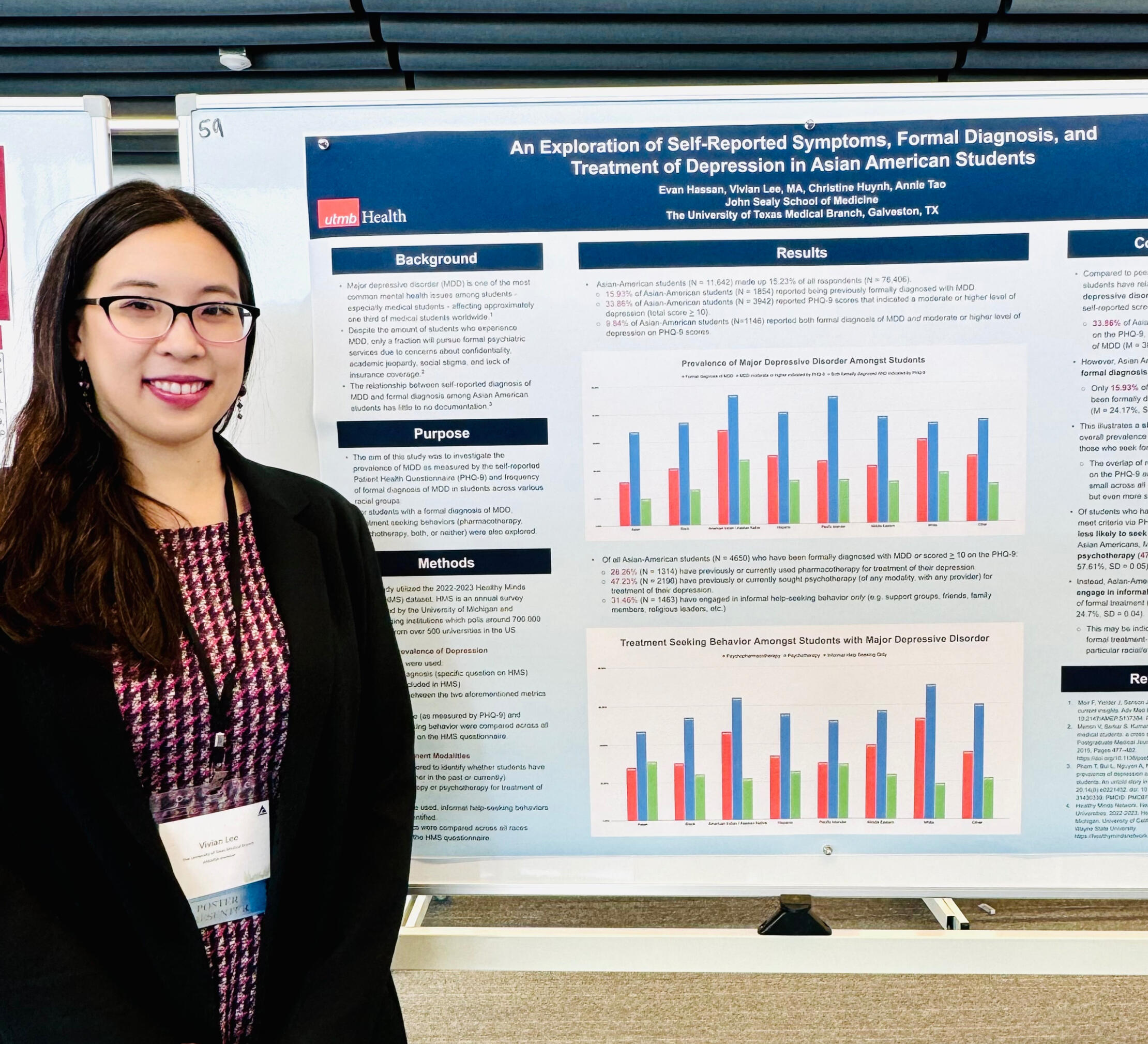 Lee, V.A. & Balderas, J. (2025, May 17-21). Eating disorder prevalence and risk amongst sexual and gender minority (SGM) college students. [Poster presentation]. American Psychiatry Association Annual Meeting, Los Angeles, CA.Lee, V.A., Jiang, M., Razzak, A., & Letcher, D. (2025, April 9). Manifestation of the bystander effect across minority racial-ethnic groups: Hypothetical intervention vs. real intervention. [Poster presentation]. 2025 Public Health Symposium, Galveston, TX.Adari, N., & Lee, V.A. (2025, March 13). Beyond the skin: Examining gender and ethnicity in excoriation-type Obsessive Compulsive Disorder. [Poster presentation]. Perspectives in Psychiatry Symposium 2025, Galveston, TX.Geddie, L.G., & Lee, V.A. (2025, March 13). Thriving without confiding? Examining college students who do not utilize friend support. [Poster presentation]. Perspectives in Psychiatry Symposium 2025, Galveston, TX.Long, C., Letcher, D., & Lee, V.A. (2025, March 13). Resilience and adaptability in student athletes. [Poster presentation]. Perspectives in Psychiatry Symposium 2025, Galveston, TX.Lee, V.A., Gonzalez, N., Balderas, J., Huynh, C., Kuttana, N., Kang, S., Elizondo, K., & Oorjitham, N. (2024, December 9). Eating disorders in LGBTQ+ college students. [Poster presentation]. 2024 Allies in Health LGBTQ+ Health Research Symposium, Galveston, TX.Lee, V.A. (2025, May 17-21). A mixed methods study of cultural considerations for eating disorder treatment. [Poster presentation]. American Psychiatry Association Annual Meeting, Los Angeles, CA.Lee, V.A. (2024, November 8-9). Cultural considerations in eating disorder treatment. [Poster presentation]. Texas Society of Psychiatric Physicians 68th Annual Convention and Scientific Program, Galveston, TX.Chen, C., Lee, V.A., Agrawal, V., & Oorjitham, N. (2024, November 8-9). An analysis of major depressive disorder prevalence and treatment-seeking behaviors in medical and non-medical graduate students. [Poster presentation]. Texas Society of Psychiatric Physicians 68th Annual Convention and Scientific Program, Galveston, TX.Jiang, M., Letcher, D., Phan, B., Hassan, E., Agrawal, V., & Oortjitham, N. (2024, November 8-9). A comparative analysis of depression and help-seeking behaviors among graduate and undergraduate students. [Poster presentation]. Texas Society of Psychiatric Physicians 68th Annual Convention and Scientific Program, Galveston, TX.Lee, V.A., Malik, M., & Oorjitham, N. (2024, November 8-9). Evaluating the need for group counseling services in a student-run free clinic. [Poster presentation]. Texas Society of Psychiatric Physicians 68th Annual Convention and Scientific Program, Galveston, TX.Malik, M., Lee. V.A., & Oorjitham, N. (2024, November 8-9). Development of a street psychiatry protocol. [Poster presentation]. Texas Society of Psychiatric Physicians 68th Annual Convention and Scientific Program, Galveston, TX.Hassan, E., Agrawal, V., Razzak, A., Huynh, C., Lee, V.A., Inikori, O., & Oorjitham, N. (2024, November 8-9). A comparison of self-reported symptoms, diagnosis and treatment of depression in undergraduates and medical students. [Poster presentation]. Texas Society of Psychiatric Physicians 68th Annual Convention and Scientific Program, Galveston, TX.Hassan, E., Lee, V.A., Huynh, C., Santiago, D. (2024, April). An exploration of self-reported symptoms, diagnosis, and treatment of depression in Asian American students. [Poster presentation]. Texas Society of Psychiatric Physicians 2024 Spring Conference, Austin, TX.Hassan, E., Lee, V.A., Huynh, C. (2024, April). An exploration of self-reported symptoms, diagnosis, and treatment of depression in Asian American students. [Poster presentation]. 2024 Public Health Symposium, Galveston, TX. (3rd Place Research Poster Award)Hassan, E., Lee, V., Huynh, C. (2024, March). An exploration of self-reported symptoms, diagnosis, and treatment of depression in Asian American medical students. [Poster presentation]. Asian Pacific American Medical Student Association 30th Annual National Conference, Las Vegas, NV.